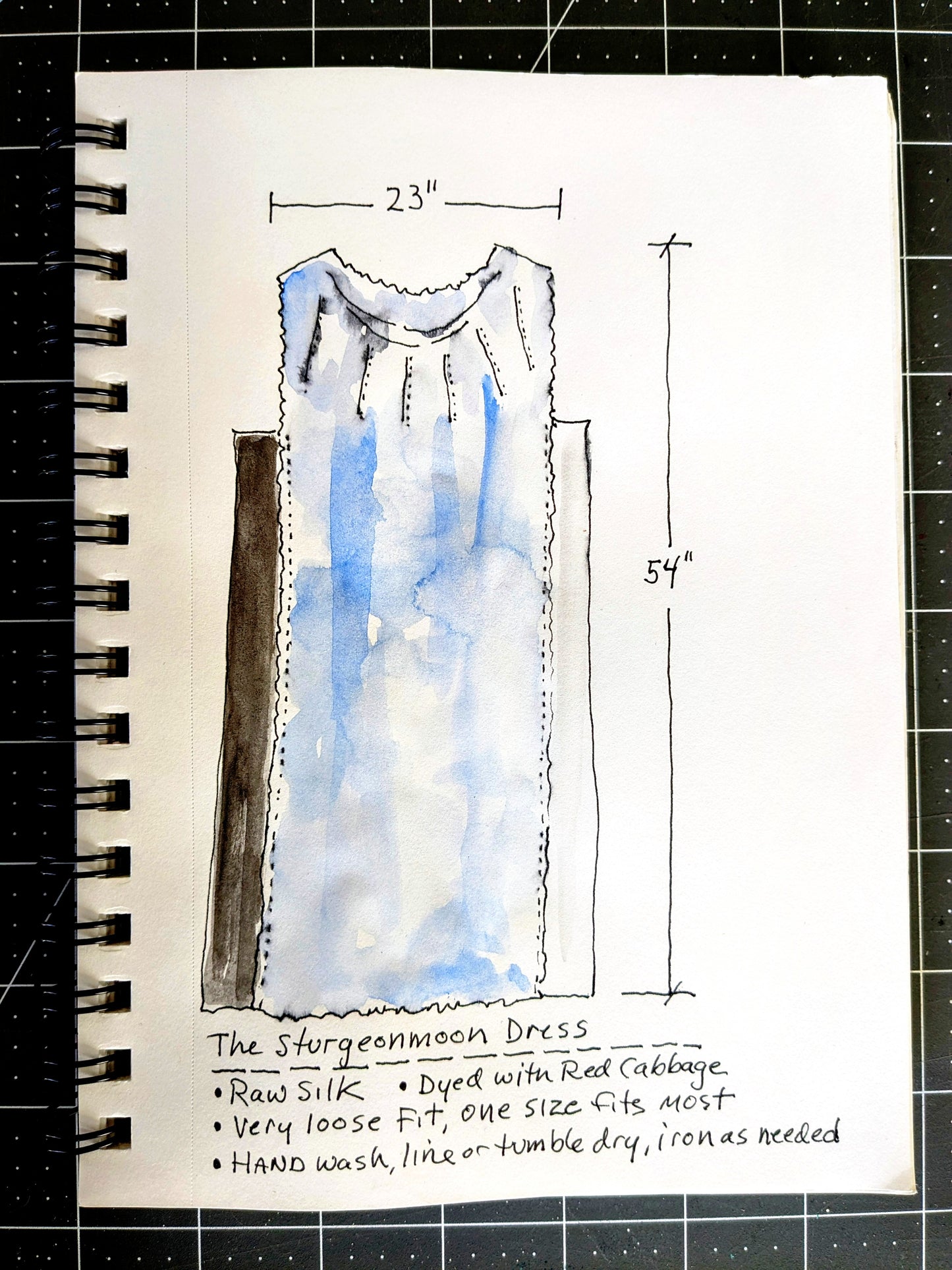Plant dyed with red cabbage leaves, the SturgeonMoon Long dress is made of raw silk, which offers a beautiful drape, and soft texture. The front and back are blue and white, the side panels black and white. This is a medium to large size. Handmade in Maine, one-of-a-kind.